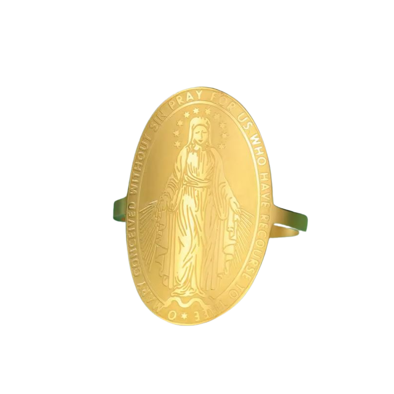 Élégante et pleine de sens, cette bague ornée de la Médaille Miraculeuse représente la Vierge Marie, symbole de protection, de grâce et de foi. Discrète et raffinée, elle se porte facilement au quotidien et apporte une touche spirituelle à votre style.